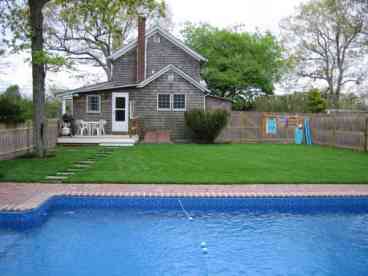 The house, originally built in 1907, is shaded by tall old trees, has a blue stone driveway bordered by lilacs, and a beautiful perennial garden surrounding the wraparound porch which has an outdoor fireplace and is furnished with white wicker rocking chairs and settee, as well as an outdoor dining table and chairs. In the back there is a deck with a gas grill, outdoor dining table and chairs, and a 16'x 32' heated swimming pool with wide steps for underwater sitting/sunning. The house is simply and tastefully furnished in country style. Downstairs, the living room has a lovely hearth/fireplace