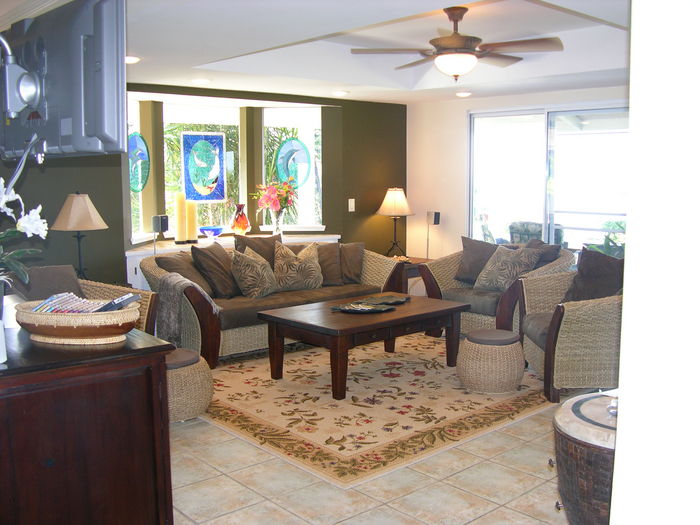 On the main level is a king bedroom, with Tommy Bahama bed, Queen bedroom, and bedroom/office with 2 full futons (spring mattress futons) opens onto ocean view and lanai. There is a full bath on main floor and also an outdoor 1/2 bath and shower by the swimming pools.