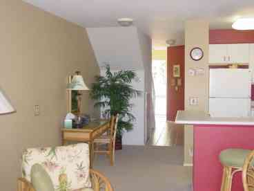 The comforts of home in Paradise! This beautiful Condo is just steps away from the second fairway at Waikoloa Villages Golf course, nestled between Mauna Loa and Mauna Kea volcanoes looking out over the ocean. Just 10 minutes from the best white sand beaches on The Big Island and great shopping at Kings Alley Shopping Center, and 25 minutes to the airport. This is an ideal spot for your vacation adventures. The Greens is a luxuriously landscaped Condo complex with pool and children’s pool, Jacuzzi, barbecue, work out room, tennis courts and a climbing structure for kids. Full-size grocery store, a bank, pharmacy, medical facilities and restaurants are within walking distance. The three bedroom, three full bathroom condominium is newly furnished with a tropical motif and colorfully painted. It has a great 1200 square foot floor plan. Upstairs are two master bedroom suites, each with its own bathroom and queen beds. One bedroom faces the ocean with a lanai and view of the ocean, the other faces Mauna Loa. The third bedroom is on the main level with twin beds and a bathroom. The main level living room is equipped with a sleeper sofa, coffee table, easy chair and a desk. The living room lanai has patio table and chairs for outdoor dining. The fully equipped kitchen has everything you need for home cooking.