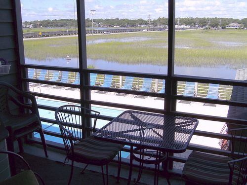 Heart of Garden City Beach, SC .. 1st floor condo with dishwasher and 3 TVs. 1 Queen bed, 1 Double and single is a futon bunk, 1 sofa bed . 1 block from Beach. Overlooks nature filled saltwater marsh. Approximately 700 sq ft . **Garden City Pier 1 block .. arcades .. restaurants all in 1 block area -Pool- Screened Porch-Marsh View- Microwave- Dishwasher- Cable TV- TVs in every room- Hot Tub- Washer/Dryer (In Unit)