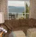 Panoramic views of Puget Sound from this comfortable waterfront home with two view decks and lots of windows. Tastefully appointed vacation getaway near Seattle with three levels of water views, offering a bedroom and bath on each level (extra bedroom on lower floor), nicely accommodating up to ten people, yet intimate enough for fewer. More information at homeonthesound.com. Comfortable living room and adjacent dining room feature exceptional views, opening to a large view deck with additional seating and a gas BBQ. Kitchen is fully equipped and living room offers plenty of seating with TV, VCR, DVD, and stereo plus wireless internet.
