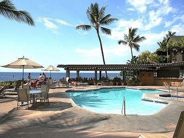 Kanaloa at Kona is a Tropical 17 acre gated condominium community surrounded by the Blue Pacific Ocean and the Kona Country Club Golf course. It is near all amenities including shopping,movies, golf, kayak rentals,Outrigger Club,snorkeling, SCUBA, boating and ocean access. On site activities center. Kanaloa is a 4 STAR resort! This upscale complex has three pools, three hot tubs and two tennis courts, many BBQs, as well as an on site restaurant. Your vacation home of 1500 sq.ft. has vaulted ceilings, great views of the golf course and partial views of the ocean from three private lanai's. Bedrooms include two Full size beds in the guest bedroom on the main floor and a King bed in the master bedroom upstairs. Kitchen is fully equipped. Body boards,beach chairs, tennis racquets, beach towels are provided for your enjoyment.