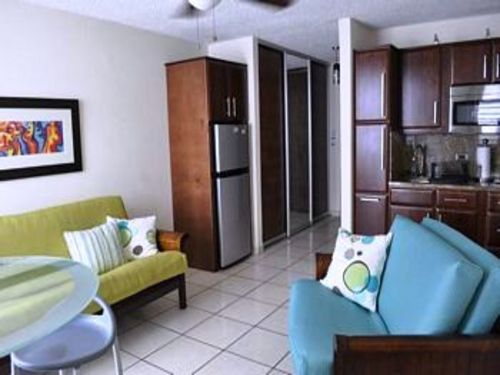 Remodeled full equipped beautiful studio apartment with lateral ocean view. Located walking distance to the very popular Isla verde beach. This long wide beach is excellent for walking and swimming and also affer a great water sports (jet sky rental, banana boat, para-sailing, etc). The perfect location to stay in Puerto Rico. The apartment includes1 full futon bed and 1 futon twin bed. Full equipped kitchenette, refrigerator, air condition, cable TV, internet, DVD, am/Fm/Cd radio, fan. All utensils, linens and towels. Beach chairs and cooler to take to the beach. 1 private parking and laundry facilities..