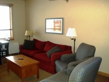This two bedroom two bath property has approximately 1137 sq. ft. and can sleep a maximum of 6 people. The entry way and kitchen have slate floors and the counter tops are black marble. The counter can seat 2 people. The master bedroom has King split bed and a private bath with ceramic tile. There is also a TV in the master bedroom with a private deck with a valley views. The other bedroom also contains another Queen and a shared bath. This property has a stackable washer and dryer. The living room has a TV and DVD player, a sleeper sofa, gas fireplace and valley view from the deck. The common areas include a two story lobby with large stone fireplace and lounge area. Morning Eagle Lodge guests will have use of a heated, secure underground parking garage and ski locker. An outdoor hot tub is located on the top floor of the lodge to take advantage of the surrounding views. Morning Eagle Lodge guests will have admittance to the only fitness facility located on-mountain.