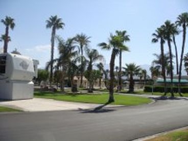 This is a 34ft 5th wheel rv and golf cart in the ultimate rv resort and country club in the palm spring area. 24 hour security in this gated community, on site restaurant, hair salon, espresso cafe, and a 27 hole golf course.