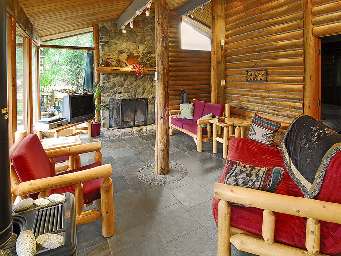 Prospector's Bend is a beautifully appointed 2 bedroom riverfront cabin in the historic town of Gold Bar (an old gold prospector's camp) in the foothills of the North central Cascades. Nestled on the banks of a sweeping bend of the majestic Skykomish River, large floor-to-ceiling windows offer incredible views of the rushing rapids, river bend, and mountains in the distance. Two stunning entertainment decks wrap around to showcase views of trains passing by, splendid forest scenery, and a luxurious hot tub with all the amenities: built-in stereo, jetted waterfall, and color-changing LED lights. The distinctive décor features log furniture, a gorgeous river rock fireplace, historic barn wood from the late 1800s, unique vintage touches of the gold prospecting era, and split log finishes throughout. An outdoor fire pit awaits and a short path just off the property leads to a sandy beach framed in enchanting old-growth stumps, a swimming hole, and a neat rope swing for added enjoyment.