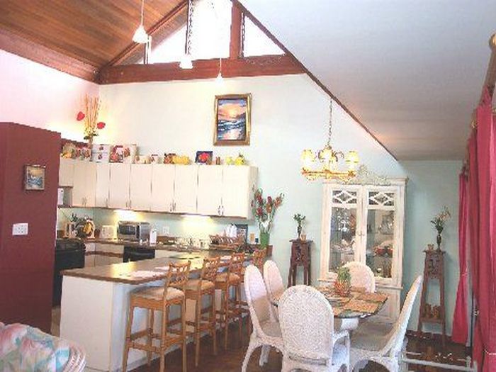 Located in an Upscale neighborhood on a quiet street, with beautiful gardens, and covered carport entry. Just over an acre of gardens and mature tropical foliage. This home has an open living area layout with vaulted ceilings. The Master Suite has dbl sink, shower tub, small private lanai, and walk out to main lanai & hot tub. 2nd bath is a full bath as well with a shower tub. Perfect for a couple that enjoys their privacy, a large family, or 3-4 couples sharing expenses.