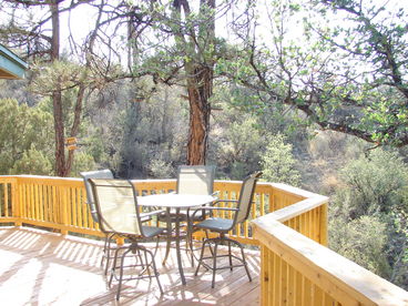 Fantastic vacation rental cabin is quiet and private on an acre in the tall pines, yet only minutes to downtown Prescott, shopping, dining, etc. Three bedrooms, two baths, fully furnished and all amenities: fully equipped kitchen, laundry room, cable tv. Great views of the mountains from the rear deck plus relaxing front porch. Fenced yard; dog friendly.