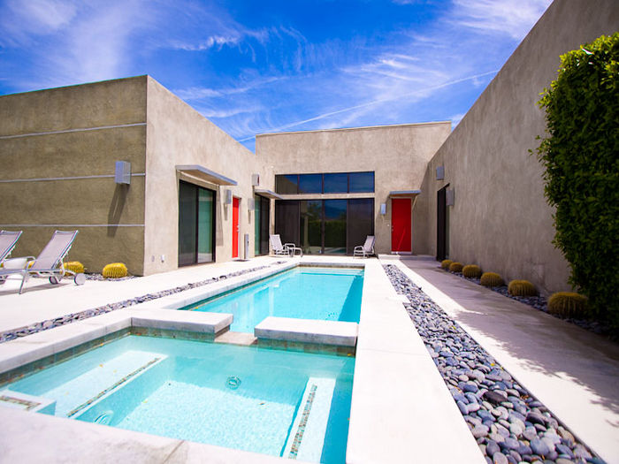 This spacious 3 bedroom modern home is the perfect swanky Palm Springs escape. The almost-new 2800 square foot home is stylishly decorated with polished cement floors, stunning mid-century decor and modern art and comfortable, contemporary furniture. It is designed to facilitate easy entertaining with an open floor plan and a seamless flow from inside to outside using large sliding doors with easy access to the pool, and a large resort-like yard from any room in the house. This spotless home features oversized rooms, with bright large windows, stunning designer bathrooms, zoned temperature control, salt water pool and spa, and a flawless, unobstructed view of Mount San Jacinto. The kitchen is a chef's or entertainer's dream with industrial quality state of the art appliances. The Master Bedroom boasts a comfy king-size bed, large walk in closet, a private patio/reading area with outdoor sofas and stunning mountain views. Oversized designer rain shower, modern changing area, and a small office are with a flat screen TV complete the gorgeous master bedroom. Two Guest Bedrooms (one is attached and second is a fully private casita with separate entrance) contain queen size beds with high-end linens and mid-century modern decorations, large closets and dressers. One guest bathroom contains an oversized soaking tub and the other a heavenly shower that is double the size of a regular shower. The fully stocked gourmet kitchen has all the amenities of true luxury with stainless appliances including industrial gas stove/oven, convection oven/microwave and dishwasher. The kitchen contains all dishes, cookware and serving ware needed for your stay. Separate dining Area with seating for up to 6 people with additional tables and chairs if needed. Living Room has ample seating, a 32-inch cable TV with surround sound stereo system, 5 disc CD changer, DVD, VHS, and MP3 plug-in. Along side the pool and spa, you will find a cozy outdoor fire place for evening outdoor entertaining, bikes, table tennis/ping pong and plenty of space to enjoy the outdoors. Available for small events with an extra fee and deposit.