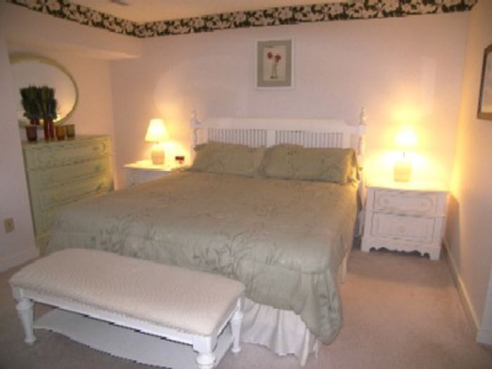 Moving upstairs, enjoy the added room of a king sized bed in the master bedroom with another lighted ceiling fan with remote control (Ladies, this comes in very handy for me! The remote stays right by my nightstand. LOL). The master bedroom has a walk-in closet and a TV with a VCR player. The master bathroom has all new vanity, sink, faucet and mirror. The 2nd bedroom has two twin beds, with a 19" Flat Screen TV and DVD/VCR player. The 2nd bathroom upstairs has all new vanity, sink, faucet & mirror. Both bathrooms have showers.