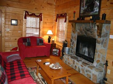 burning fireplace and satellite tv with DVD & VCR. The bedroom on