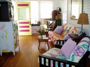 Come and relive your childhood memories of trips to the beach. Original 1930's Tybee Island Beach cottage. My Beach House is the fourth house from the beach, a short walk over the dunes to the shore. No streets to cross to get to the beach. Two blocks to town, pier,shops,pubs,shopping and restaurants. My Beach House is filled with vintage furnishings which are for sale to our "Tybee cousins". Upstairs: Two bedrooms, one kingsize bed and one with two twins. Wonderful sunny living room with queen futon, full bath with nice ceramic tile shower (large with great water pressure), full kitchen and eating area. There is a large wrap-around screened porch upstairs. Back yard is fenced-in for safekeeping of your pet. The original "summer house" has been restored with daybed, game table/games, dresser. Downstairs: Open-style suite with queen bed, pull-out double sofa, full kitchen, living room and eating area. Foosball/pingpong and more games in the downstairs area and hammock under the palms. My Beach House is located on a private sandy lane, very safe for children, no traffic, parking for two to three cars. DVD.VCR Cable TV Roleez Beach Cart, beach chairs, beach bikes, umbrellas, beach towels, sand toys, beach metal detector for beach treasure hunting horseshoes croquet coolers boogie boards beach bikes
