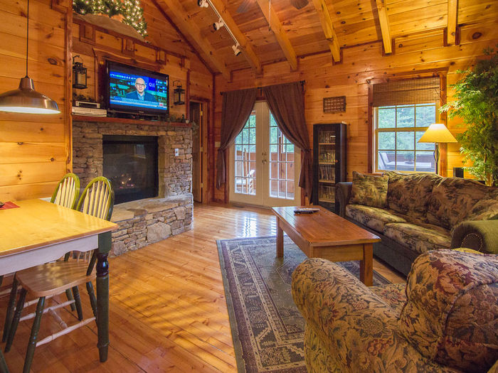 Peaceful and quiet, you can enjoy breakfast at sunrise overlooking the water from the screened deck. Or after a long day of hiking, shopping or exploring Gatlinburg and Pigeon Forge, return home for a relaxing soak in the hot tub. Inside, you'll find a fully equipped kitchen, dining table for 4, living area with a 42" flat screen TV, DVD movie collection, Gamecube video game system, and wireless internet. The sofa converts to a queen size sleeper sofa but we also have a queen size electric air mattress that is even more comfortable. The king bedroom is the perfect retreat with a gas fireplace from October 1-April 30. The ensuite heart-shaped jacuzzi tub adds a romantic flair, while the full bath is roomy and offers an oversized shower.