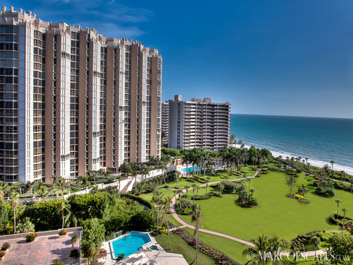 Located directly across the boulevard from the Venetian Village shopping and restaurants, The Savoy is a luxury beachfront high-rise unlike others. This large one level beachfront condo offers the elegant comfort of a luxury townhome, and is located in the very desirable southwest corner of the building - allowing for spectacular beach and park views with radiant sunshine in the condo even during the winter months!! Residents indulge in its spacious feel and exquisite beachfront view from the 14th floor, one story greatroom. Dual terraces give you stunning night and day views of the bay and gulf. Bright and inviting, this 2 bedroom, 2 bath condo features ceramic tile floors, granite countertops, tile backsplash, and classic southern wood shutters. Amenities include two tennis courts above the parking garage, a biking and jogging path, fitness center, grilling area and roof-top patio, large beach-front heated pool and spa, 24/7 doorman and covered parking. Beautiful, new atrium lobby and 24-hour security make your Naples experience at The Savoy complete!
