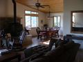 main living area where you can look through pine trees to the