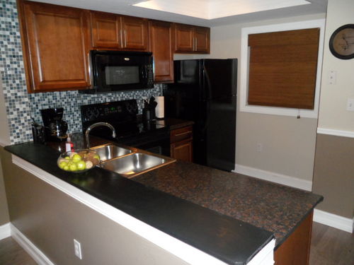 This newly remodeled condo with two bedrooms ( Queen Master Bed and (2) Twins in the Guest room) and two bathrooms. The Master is equipped with a 22 inch TV set. The master bath has a walk in shower, while the second bathroom has a traditional bath tub with shower. The living room has a leather couch and love seat, 32 inch LCD TV, blue ray disk player and AM/FM Stereo. A wireless router and printer are also available for use. A new fully equipped kitchen includes dishwasher, coffee maker, crock pot, toaster and a blender for those frozen happy hour cocktails. A screened lanai is furnished with sling back chairs and a slate topped table to enjoy morning coffee or those cool fall evenings. Folding chairs are also provided for additional seating. A washer and dryer make doing laundry convenient.