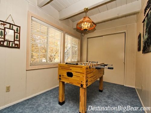 The third bedroom is a very very private loft up some stairs with no door with four bunk beds. Terrific Location!!! Walk across the street to Bear Mountain Slopes, Golf course and Zoo from this super clean 1600 sq ft home. With many decorator touches and views of the slopes you will enjoy the peaceful surroundings and room for the kids to play on the 14,000 sq ft lot w/level parking for 4 cars. The outdoor space offers a deck with plenty of seating to watch the crowds walk to the slopes. During the winter time, there is a slight hill for young kids to sled on and in the summertime, the HUGE YARD is inviting for adults and kids. Bring your horseshoes! The kitchen is fully equipped and there is a gas BBQ on the upper deck. Also, there are two wood burning fireplaces in a cozy setting for your enjoyment or relax in the outdoor HOT TUB. Satellite TV and DVD player in the family room. INTERNET. Three bedrooms -one queen , one king and one w / 4 bunk beds. Additional Features: FOOSBALL TABLE, Washer, Dryer, BOAT PARKING, linens and towels provided, Cable TV and DVD players The home is conveniently located to restaurants or shopping and water sports during the summer, Check out our summer rate of 2000 per month with no tax-just bring your tooth brush. Price reflects the fact that is right across the street from Bear Mountain Slopes. This is an older cabin. This is a 2 bedroom loft with a bonus living room. There is 6 beds.