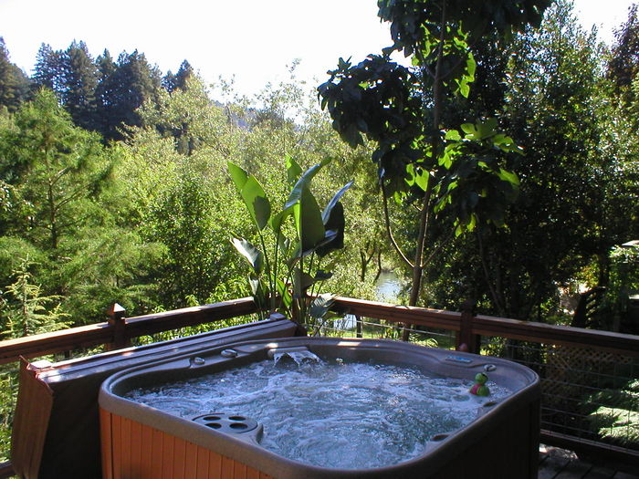 Visit northern California in style... Stay in a beautiful area away from the crowds... This unique, private, quiet Riverfront property with Direct river and Island Access is located near the world famous Bohemian Club and Grove. Unbelievably mild micro-climate (70s to 80s F April through October)... And yet near tons of great northern Califonia destinations... Great uncrowded ocean beaches, uncrowded Sonoma country wineries, ancient redwood groves (300+ feet tall), state parks, world class dining, lovely crafts, shopping villages, spas, hiking, fishing, easy biking, canoeing, kayaking, golf, and tennis... Why stay in another motel every night when you're only 90 minutes from San Francisco (south), Mendocino (north), or the Napa Valley (east)? This home is right on the Russian River in a clearing of the redwood forest in Sonoma County. In a dream setting with drop-dead views, sun, lawn, giant redwoods, ornamental and fruit trees, gardens, flowers, wildlife, birds galore (ospreys, blue herons, hawks, pelicans, hummingbirds,robins, flickers...), and nearly pesky butterflies. All this on the river with a HOT-TUB. The extra large river view redwood decks have Shaker and Amish cypress and cedar furniture for all, plus a deep seating outdoor lounge for all, a fountain, gas and charcoal grills, octagonal dining table, and many flowering plants. Soak it all in... in the riverside HOT-TUB. This riverfront, custom designed, solidly crafted, fully-equipped redwood and glass four bedroom (including large loft) three and a half bath home sleeps 8. The house is newly furnished including large HOT-TUB, luxury furniture, large hearth fireplace. The living area has a vaulted ceiling, 47" Samsung LED HDTV Home Theatre, Blue Ray DVD, Master bedroom has 32" LCD TV DVD, 2nd bedroom has 23" LCD DVD. There are large dining tables in, out, and riverside as well. There are four queen beds and two twins. All bedrooms have large closets with generous shelves, chairs, and tables. Beds have blankets, pillows, and bedspreads. Linens and towels are also included. The loft and living areas are brightened by two large skylights which also enable nighttime stargazing. The living, dining, and kitchen have full-length river view and fireplace. All new Kitchen has granite counters and bars, Maytag stainless apppliances, cherry cabinetry, river view, Fiesta service for all, and complete cookware. Large clothes washer/ dryer included. Grocery 5 min walk.