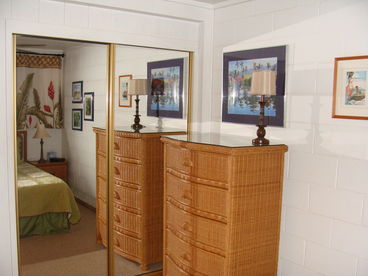 Master bedroom (Hawaiian Bedroom) has a queen size bed and second bedroom (Dolphin Bedroom) has full size twin beds. Both bedrooms have a five drawer bureaus and sliding mirror doors on the closets.