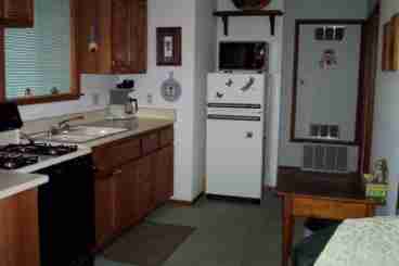Charming and cozy, 2 bedroom, 1 bath cabin. Lovely corner fireplace opens to full Kitchen and Dining Area. Stereo, Color TV, VCR/DVD Player. Double bed in one bedroom and a Queen in the other. Nice, secluded, back deck with BBQ. Sleeps 4 with 1 Queen and 1 Double. Close to Sugarloaf Park, the new Skate Park and the High School (for Sports Tournaments). NO SMOKING, NO PETS! Rates and amenities subject to change.