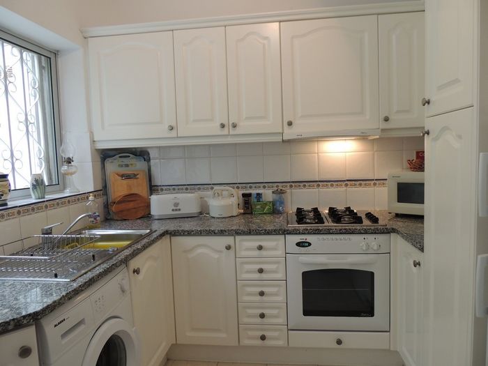 The fully fitted kitchen includes a washing machine and microwave.