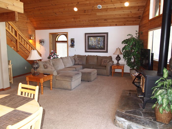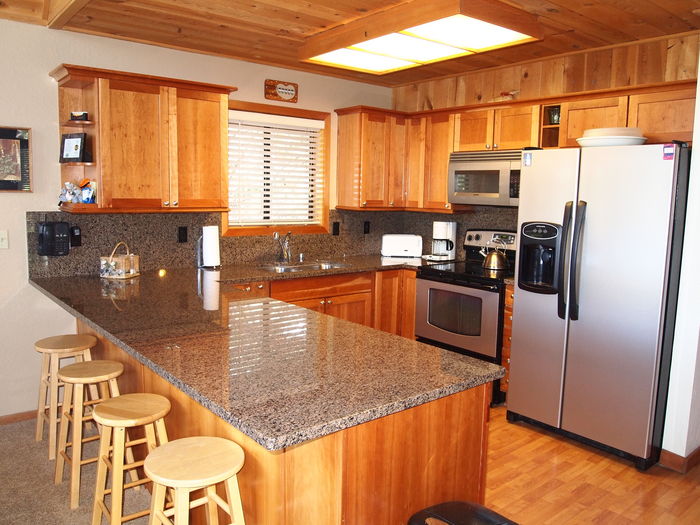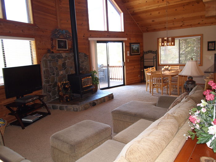 When you enter the living and dining rooms on the second floor, you will find spectacular vaulted ceilings and a gorgeous river-rock hearth surrounding a thermostat-controlled fireplace, a 55" WIde Smart screen HDTV with cable, DVD, CD player/radio. Large windows look through pine trees to the mountains in the distance and there is a large deck off of the dining room with a BBQ and table for your outside enjoyment! In the dining room there is a large table and a bar countertop with additional seating. The kitchen has cherry cabinets, granite counters and is full stocked. There is a laundry room for your use. Downstairs you will find a master bedroom with a king bed and fireplace. The newly updated bathroom has cherry cabinets, granite counters and slate style floors. The family room has a sofa, wide screen HDTV with cable, DVD and a thermostat controlled fireplace. The romantic dual sided fireplace that you can enjoy from both the bedroom and the living suite! On the main floor there are two bedrooms with queen bedrooms and a bathroom with dual sinks, travertine tile floors, granite counters and cherry cabinets. Both bedrooms have glass doors with a spectacular view over the large deck that faces the Tahoe National Forest. Upstairs there is a loft that looks over the living and dining room with a daybed (2 twins). The large master bedroom has a king bed and a daybed (2 twins). The newly updated bathroom has cherry cabinets, granite counters, travertine floor and shower with a jetted tub. There is also High speed wireless internet. This home shows pride of ownership - No hardy party crowds please. Summary: 2 kg beds, 2 qn beds, 4 twin beds Visit our Personal