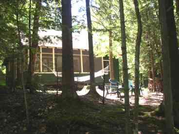 This adorable cottage sits on the Moose River overlooking the woods. It has a master bedroom, loft bedroom, eat in kitchen, bath with shower, living room with cable TV/VCR/DVD. There is a screened in porch and an outdoor deck overlooking the Moose River with patio on the front of the cottage. The master bedroom is downstairs on the Moose River side. A great screened in porch overlooking the river includes a dining area and futon. The loft upstairs is ideal for guests or children which has two double beds. The dock provides for swimming, canoeing and kayaking on the Moose River. A propane wall furnance provides warmth for chilly nights. This cottage is nestled well off the road so there is plenty of off street parking and privacy. The location of the cottage is near all activities and is within walking distance to the village of Old Forge. Beds include a Queen, two Doubles and a futon. Tenants are responsible for bringing their own linens.